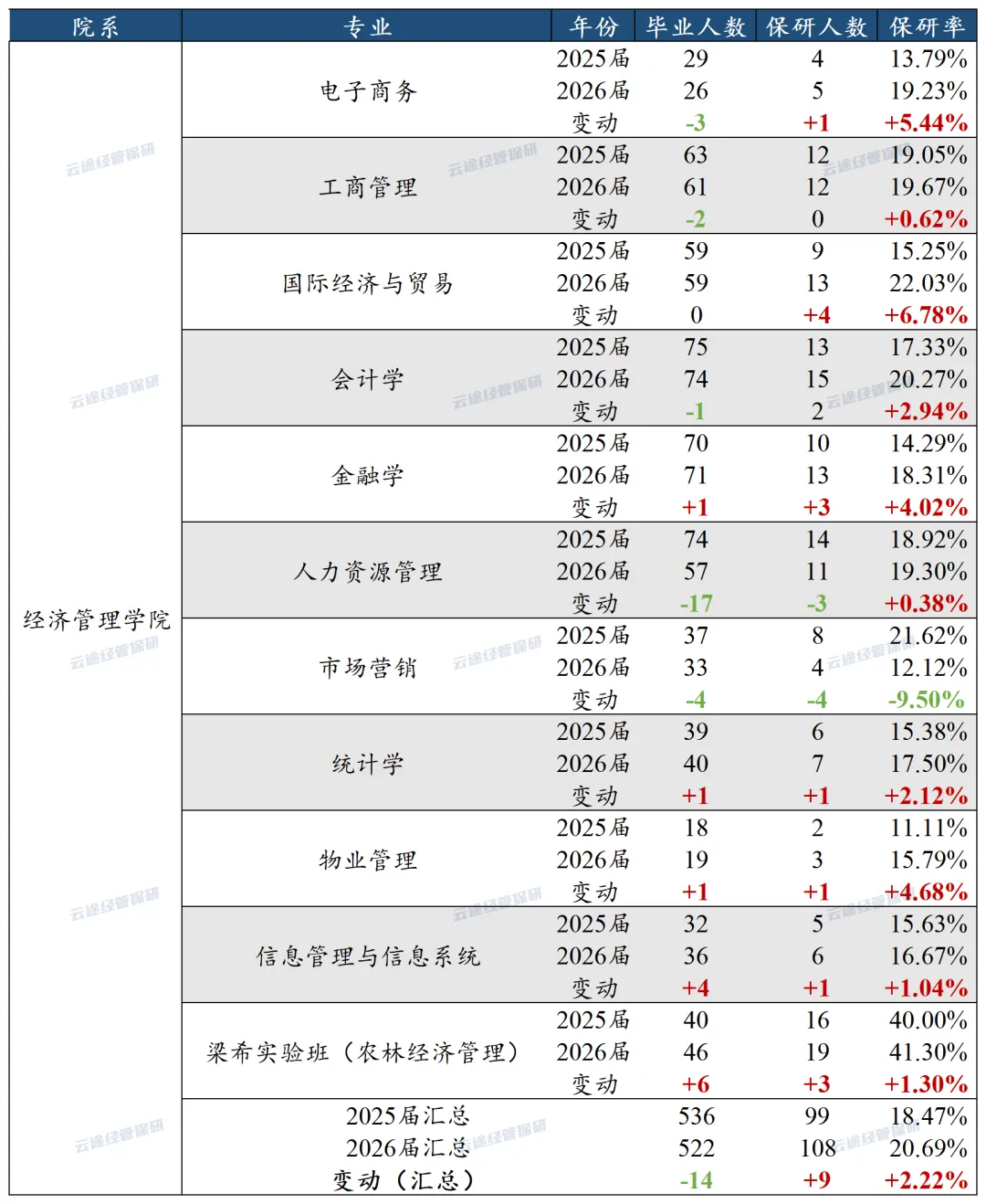 根据最终公示的推免名单,2026届北京林业大学经济管理学院共推免108人,较2025届增加9人,对应保研率20.69%,较2025届提高2.22个百分点,各专业具体情况如下: