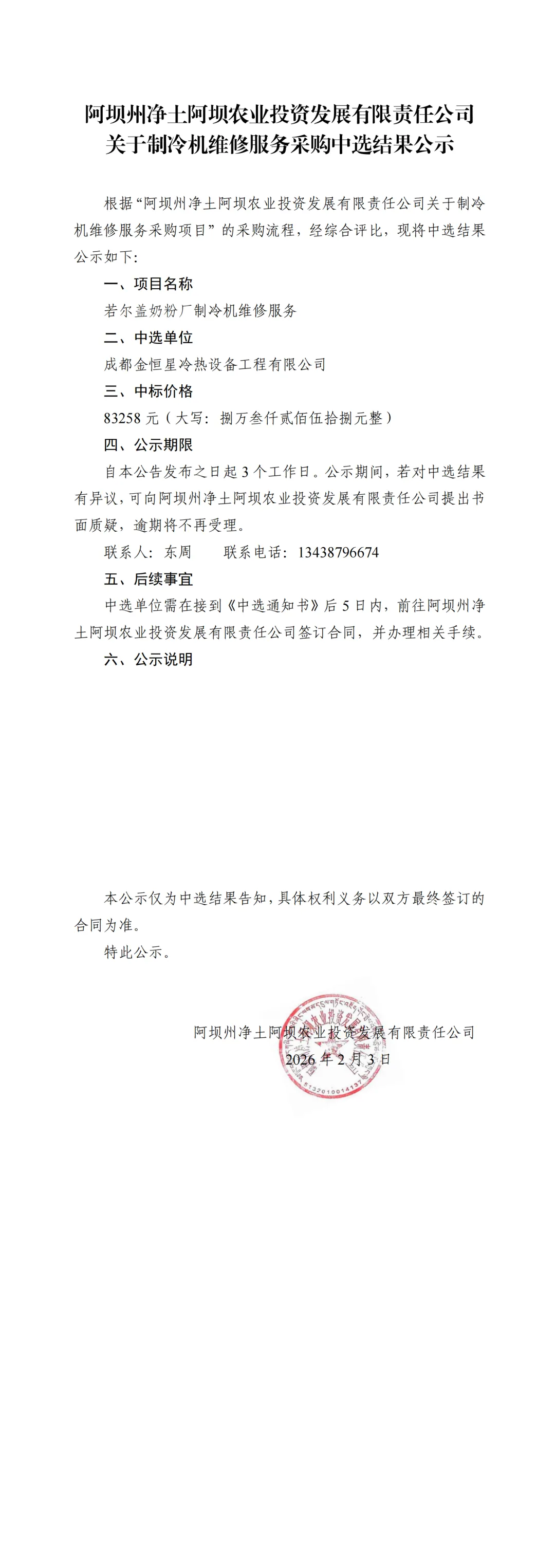 阿坝州净土阿坝农业投资发展有限责任公司关于制冷机维修服务采购中选结果公示