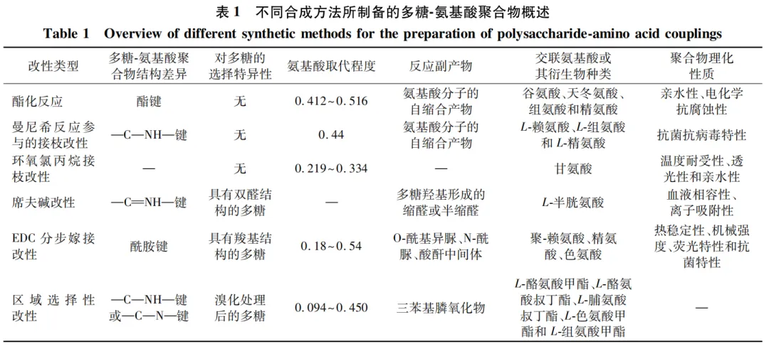 迄今为止,已开发多种合成多糖-氨基酸聚合物的方法,包括酯化、曼尼希反应、接枝聚合、席夫碱改性、1-乙基-3-(3-二甲基氨基丙基)碳二亚胺(EDC)交联及区域选择性改性,所得聚合物结构差异主要体现在连接键类型上。不同方法制备的聚合物特点总结如表1所示。