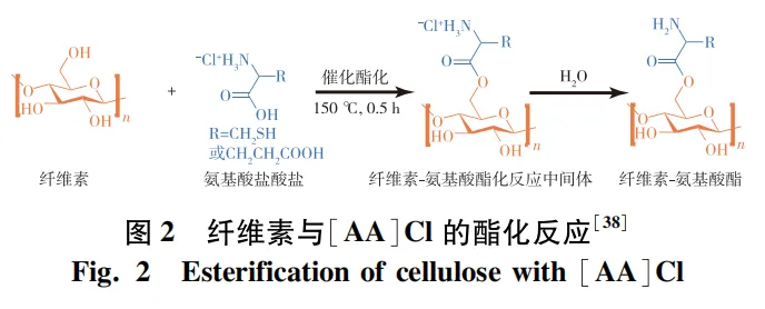 氨基酸酯化改性是一种高效且选择性强的多糖改性方法,因其能保持多糖原本结构、副反应少且机理清晰而备受关注。多糖(如KGM)在金属表面吸附能力强,但分子间氢键导致其吸水性强、溶解性差。Zhang等采用KGM与L-组氨酸/L-精氨酸在对甲苯磺酸催化下于DMSO中反应,制得魔芋葡甘露聚糖L-组氨酸酯(KGM-His)和魔芋葡甘露聚糖L-精氨酸酯(KGM-Arg)。改性后羟基减少,降低了分子间氢键作用,显著增强水溶性并降低吸水性,KGM及其衍生物的平均相对分子质量均达到105量级。更重要的是,KGM-His和KGM-Arg可作为高效缓蚀剂,能显著降低低碳钢腐蚀速率。此改性方法同样可提升多糖的阻垢性能。Zhang等用谷氨酸/天冬氨酸选择性羧化线性KGM(因支链GGM存在空间位阻无法改性),所得魔芋葡甘聚糖谷氨酸酯(KGM-Glu)和天冬氨酸酯(KGM-Asp)对CaCO3的阻垢率均大于90%,可用作高效可降解阻垢剂,其增效源于额外羧基及羧基化单糖环的吸附隔离作用。针对氨基酸自缩合及酯化效率低的问题,Wu等采用氨基酸盐酸盐([AA]Cl)合成纤维素氨基酸酯(CAE),如图2所示。[AA]Cl反应活性高(取代度为0.412~0.516,反应仅需10~50 min),其兼具溶剂、酸催化剂及氢键破坏剂作用; 氨基质子化可有效避免自缩合副反应,为纤维素高效衍生提供了便捷途径。