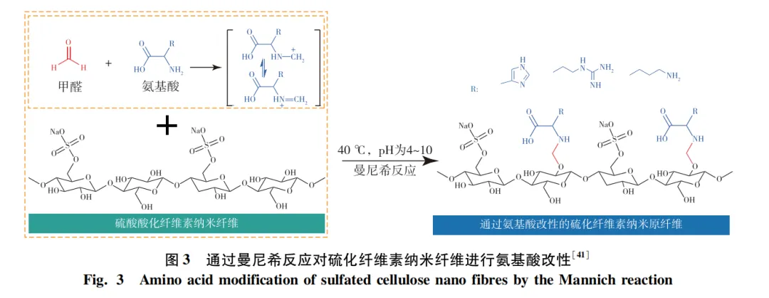 曼尼希反应是利用甲醛和胺对含活泼氢化合物进行表面改性的有效方法,可赋予材料抗菌性。鉴于木聚糖与纤维素反应活性相似,该法有望提升硫代纤维素纳米纤维(SCNF)的抗病毒性能。Hu等采用曼尼希反应,将甲醛和碱性氨基酸(赖氨酸Lys、精氨酸Arg、组氨酸His)与SCNF交联,制得氨基酸接枝SCNF(Lys/Arg/His-SCNF),如图3所示。所有改性SCNF抗病毒性均优于原始SCNF,而Arg-SCNF效果最佳,1 h可完全灭活噬菌体X174。该改性过程为SCNF引入高正电荷密度和长烷基链,从而增强其抗病毒抗菌性能,为制备高效抗病毒纳米颗粒提供了简便途径,但需进一步验证其对人类致病病毒的有效性。