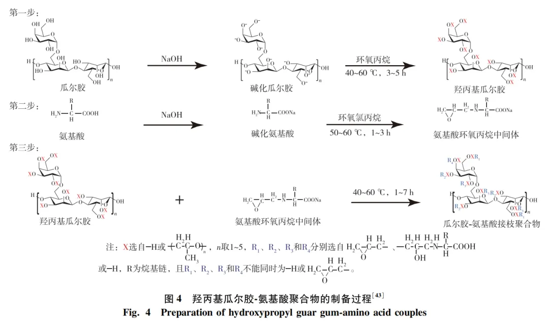 甘氨酸结构简单,具两性亲水性,广泛用于制药与合成。徐玉枫采用对甲苯磺酰氯法和环氧氯丙烷法分别制备了甘氨酸改性瓜尔胶(GA)和甘氨酸改性羟丙基瓜尔胶(HPG-GA),并对合成配方与工艺进行了优化(图4)。对甲苯磺酰氯法制备的GA热稳定性下降而熔融温度升高,且硫元素分析表明甘氨酸未完全取代甲苯磺酰基。环氧氯丙烷法则在优化条件(甘氨酸与瓜尔胶质量比1:1,50 ℃,5 h)下成功制备了GA。所得GA水溶液在耐盐性、耐酸碱性上优于未改性瓜尔胶,其透光率低于50%,使其适用于特殊涂层。HPG-GA在作为面膜精华液增稠剂时表现出低失水率、良好保湿性以及优异的耐热性、耐寒性和离心稳定性,性能优于常用增稠剂如黄原胶。