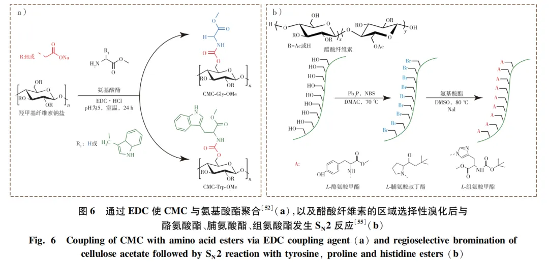 表面改性的纳米纤维素在生物医学、抗菌/过滤等领域应用广泛。EDC/N-羟基琥珀酰亚胺(NHS)偶联法常被用于其功能化,该法在水溶性、效率及反应条件上具备优势。Wassgren等采用两步法实现精氨酸改性CNF:先用TEMPO(2,2,6,6-四甲基哌啶-1-氧自由基)氧化CNF,再用EDC/NHS交联精氨酸,研究pH与时间对胺官能度的影响。活化可防止精氨酸自交联,表明仅特定活性酯中间体参与形成酰胺; 提高pH可促进伯胺脱质子,显著增加接枝量。羧甲基纤维素(CMC)因其优异的水溶性和商业可用性等特点,可在水相中与蛋白质或肽进行化学改性。Gürer等利用水相EDC反应体系,将甘氨酸甲酯/L-色氨酸甲酯与CMC交联,如图6a所示。增加氨基酸酯的浓度可使偶联效率达20%~80%,活性炭辅助碱催化脱保护提高了聚合物水溶性。表征证实氨基酸酯通过酰胺键与CMC连接,但存在EDC副产物及残留甲酯基团,该方法为多糖主链设计特定肽提供了途径。