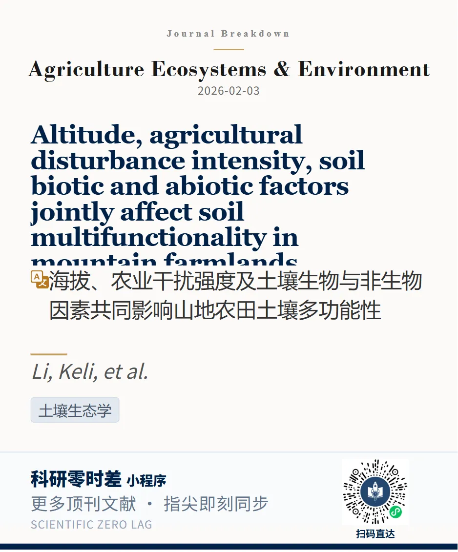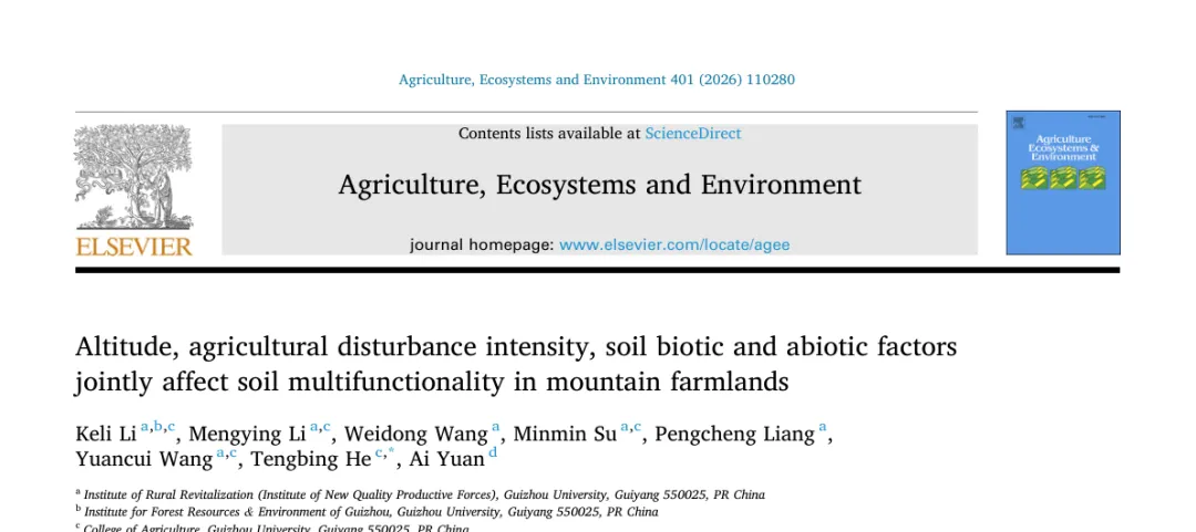 我们通过小程序科研零时差追踪到: 「Agriculture, Ecosystems and Environment」近期发表题为“Altitude, agricultural disturbance intensity, soil biotic and abiotic factors jointly affect soil multifunctionality in mountain farmlands”的文章。第一单位为贵州大学。