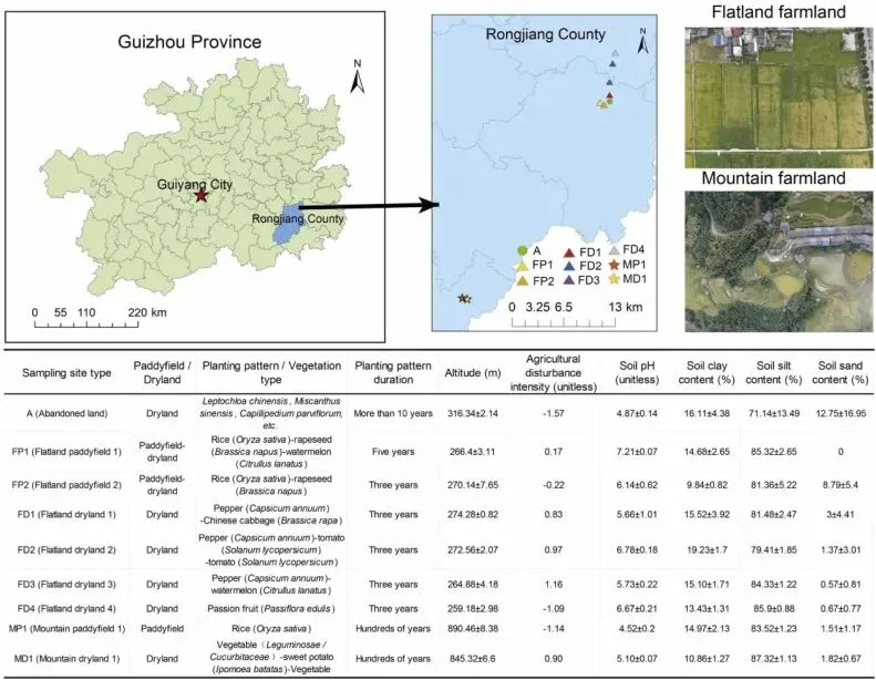 山区生态系统由于地形复杂和形成条件严苛,具有较高的环境脆弱性和较低的生态弹性。在全球范围内,山区农田不仅是生物多样性的宝库,也为人类提供了关键的生态系统服务。然而,随着人口压力的增大和耕地资源的限制,西南山区(如贵州)的农业生产方式正经历显著转型,由传统的水稻种植转向高经济价值的作物栽培,且农业集约化水平不断提高。这种转变伴随着频繁的土壤扰动、化肥农药的大量投入以及耕作制度的改变。尽管学术界已知土壤多功能性(SMF)受到生物和非生物因素的影响,但在生态敏感的山区,农业干扰强度(ADI)如何通过改变土壤微生物群落结构、网络复杂性及其稳定性来进而驱动SMF的具体机制尚不清晰。
