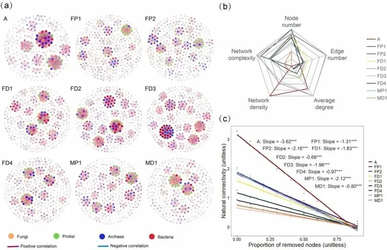 其次是土壤生物群落的深度解析。研究利用高通量测序技术分析了细菌、真菌、古菌和原生生物四个类群。除了常规的Alpha多样性(Chao1、Shannon、Pielou指数),作者重点构建了跨类群的共发生网络(Co-occurrence Network)。网络复杂性通过节点数、边数、平均度、网络密度等拓扑参数归一化求均值获得。此外,还通过模拟节点移除(随机或定向)来计算自然连通度的变化,以此衡量生物群落的稳定性(Robustness)。这种多营养级、多维度的生物学表征,使得分析不再局限于“物种多寡”,而是深入到“群落结构与互动”。