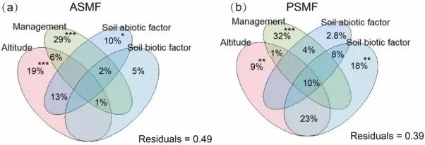 为了确定各因子的相对贡献,作者采用了变差分解分析(VPA)。将解释变量分为海拔、农业管理、非生物因子和生物因子四个模块。这种方法能够清晰地展示各模块独立解释的变异份额以及它们之间的共同解释部分(Figure 8),有效应对了变量间的共线性问题。