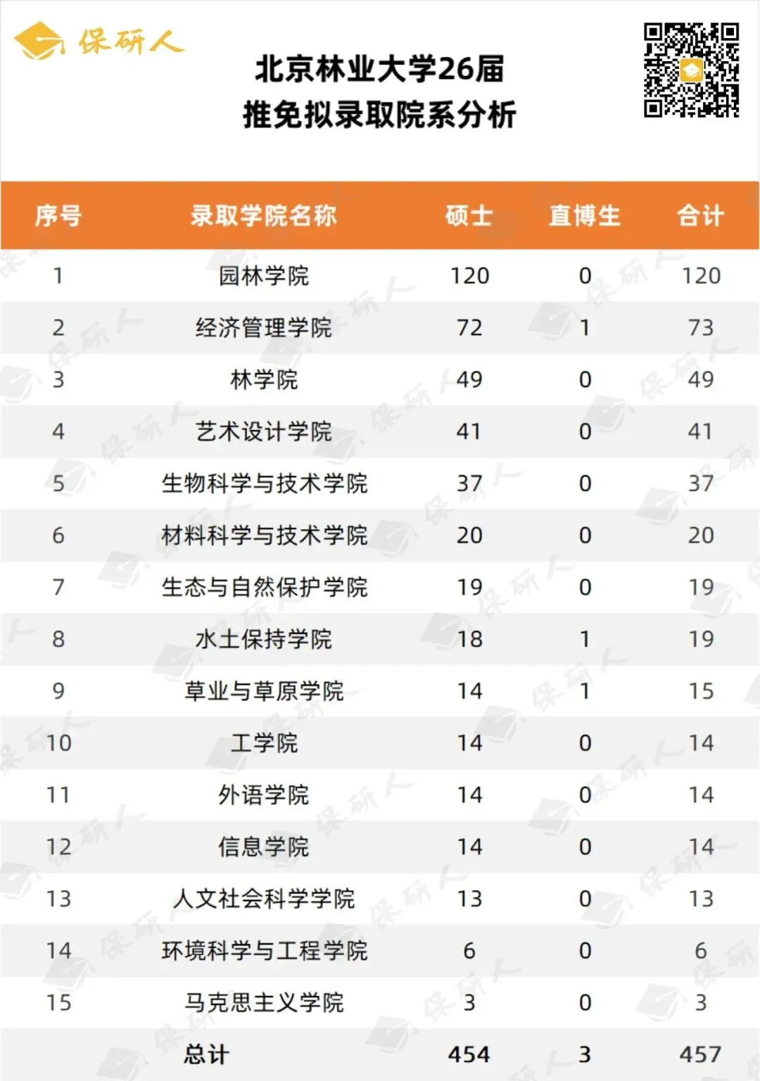北京林业大学2026年共拟录取推免硕博生457人,其中硕士454人,直博生3人。