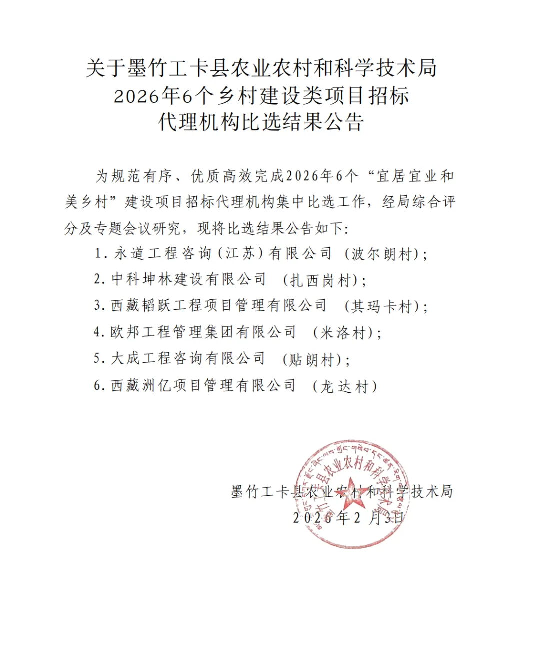 关于墨竹工卡县农业农村和科学技术局2026年6个乡村建设类项目招标代理机构比选结果公告