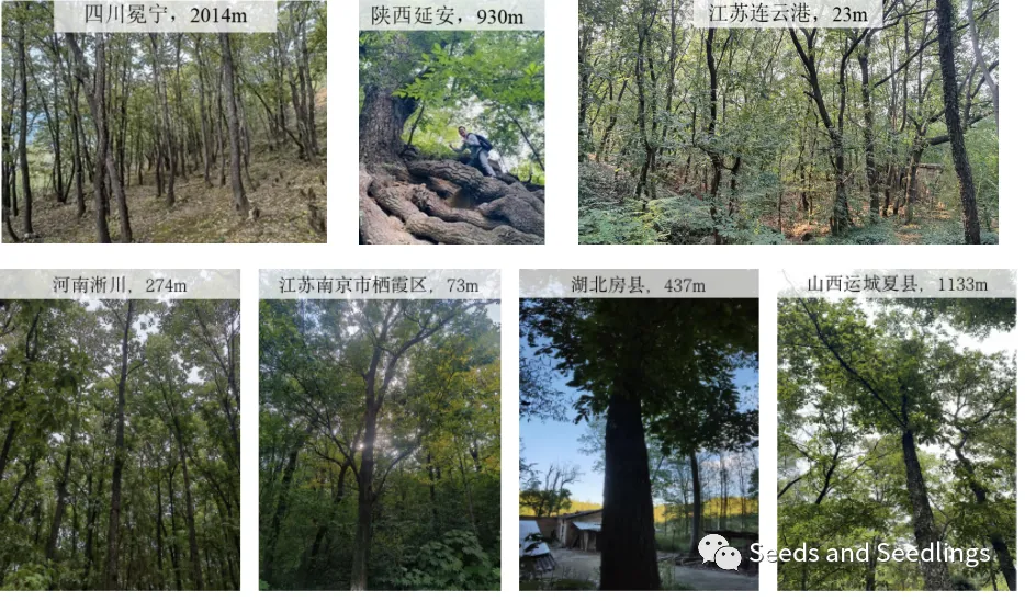 在本次采集过程中,中心共派出17名成员开展外业工作,在与各地林场工作人员进行友好交流后,历时两个多月,最终于全国21个省标记优树396株,采集256个家系、101个种源混采。采集的栓皮栎资源分布横跨经度24°,纵跨纬度17°,海拔分布23米(江苏连云港)至2014米(四川冕宁)。