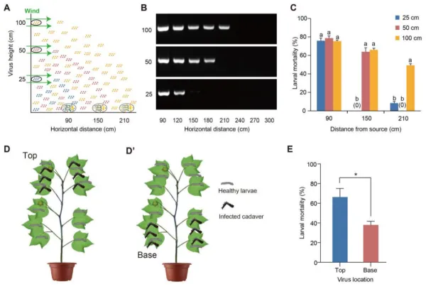 该研究以棉铃虫(Helicoverpa armigera)与棉铃虫核型多角体病毒(Helicoverpa armigera single nucleopolyhedrovirus,HearNPV)为研究模型,首先通过模拟自然条件下的风力传播实验,系统证明了染毒幼虫在高处死亡可显著促进病毒的传播扩散,从生态学层面明确了病毒诱导上爬行为的适应性意义(图1)。