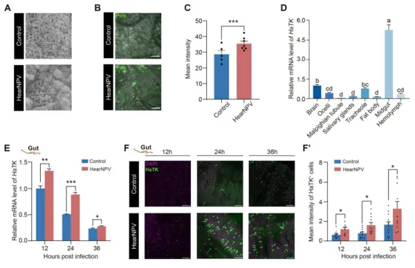 进一步研究发现,HearNPV感染首先作用于寄主中肠,引发中肠内分泌细胞钙信号增强,并显著上调中肠来源神经肽速激肽(Tachykinin,HaTK)的表达与分泌(图2)。