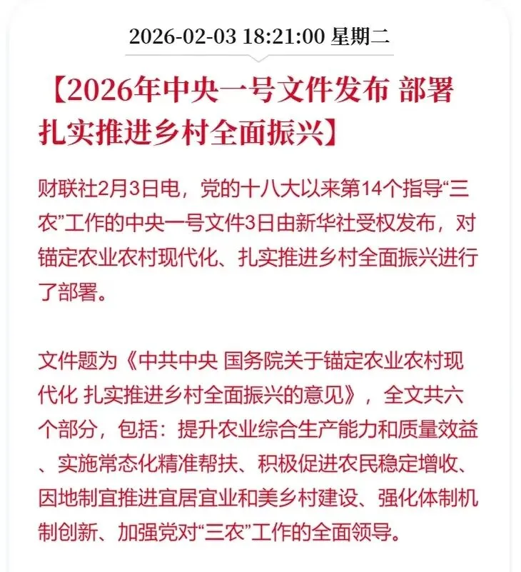 重磅!十五五首份中央一号文件发布,农业AI、无人机、乡村振兴全是风口!以及周三盘前热门题材概念梳理!