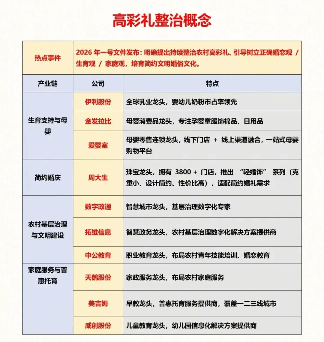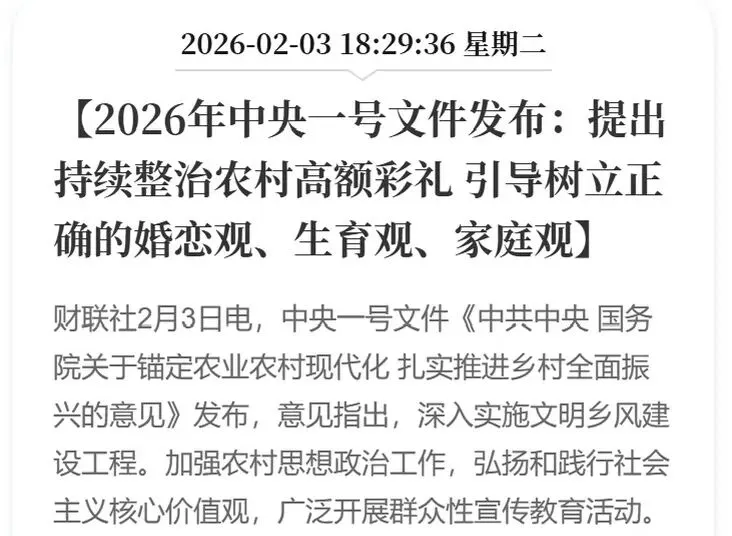 特别声明:只做行业科普不作推荐,不对任何人构成投资建议,资料取材网络仅供参考,不能作为投资依据。理财有风险入市需谨慎!党的十八大以来第14个聚焦“三农”的一号文件正式落地,锚定农业农村现代化目标,从提升农业生产能力到促进农民增收,从精准帮扶到和美乡村建设,六大维度为乡村全面振兴按下加速键,农业农村发展迎来全新机遇。移风易俗!中央一号文件剑指农村高额彩礼。2月3日最新消息,2026年中央一号文件明确提出,持续整治农村高额彩礼,推动文明乡风建设,引导农民树立正确的婚恋观、生育观与家庭观,为乡村全面振兴筑牢精神文明根基。(3)周三热门:石油石化概念