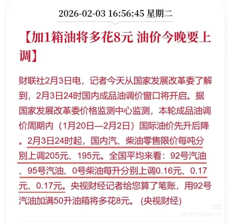 2月3日24时起,国内成品油价格迎来上调,92号汽油、95号汽油、0号柴油每升分别上涨0.16元、0.17元、0.17元。按普通家用车50升油箱计算,加满一箱92号汽油将多花8元,有加油需求的车主可以提前去加满油了。题材概念驱动事件:2月3日上海政府工作报告提出,2026年大力培育脑机接口等未来产业;2月3-4日天津举办2026脑机接口开发者大会,主题“技术开源、生态共建、产业落地”,加速技术规模化应用。九部门联合发文“乐购新春”方案,鼓励各地增加以旧换新补贴、加大线下零售支持,推动汽车、家电、数码、智能产品展销与体验专区建设,叠加春节旺季,大消费题材概念有望迎来补涨~~机器人奇妙夜,智元机器人官宣:2月8日20:00全球直播,数百台机器人主导歌舞、小品等节目,芒果TV/AGIBOT/稚晖君账号同步播出,展示交互、运动、多机协同技术。