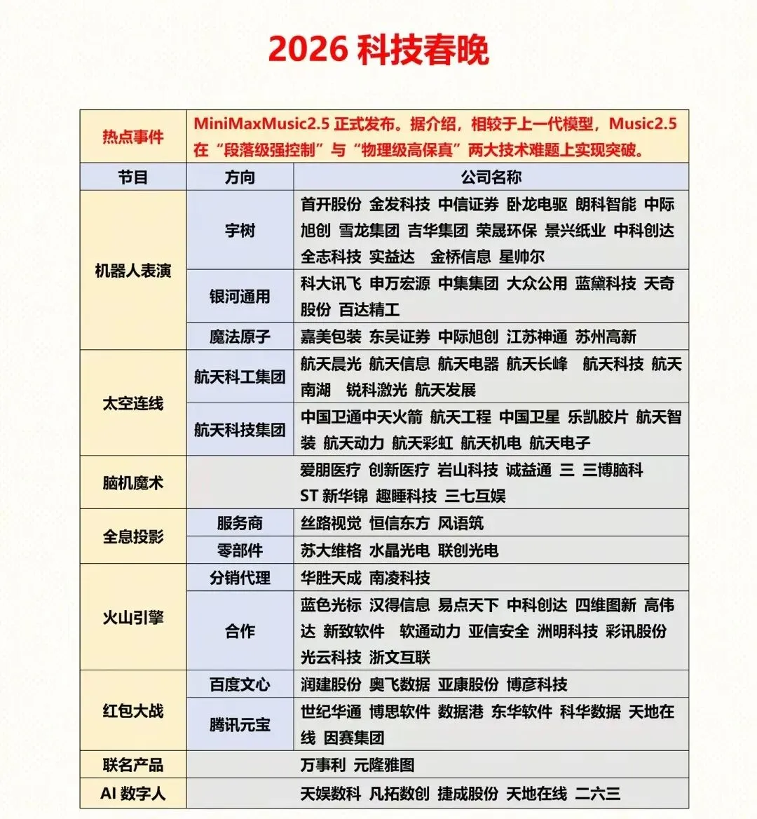 2026科技春晚概念股全名单曝光!2026科技春晚成硬核科技风向标,MiniMax Music2.5率先突破技术难题,机器人表演、太空连线、脑机魔术等九大板块轮番登场,宇树、银河通用、航天科工/科技集团等龙头携产业链伙伴亮相。《现代化首都都市圈空间协同规划(2023-2035年)》重磅发布,城市更新、交通一体化、数字经济等主线迎来爆发机遇。🚀 半导体/芯片板块年报预增全名单出炉当前半导体行业正处于周期上行与技术升级的共振期,AI算力需求、国产替代加速等多重因素驱动业绩释放。投资有风险,入市需谨慎。资料仅供参考不能作为投资依据,文章提及个股只做科普,不作推荐,不对任何人构成投资建议!更多热门题材概念,进入下方主页收索关键即可查看!点赞关注下次不迷路!