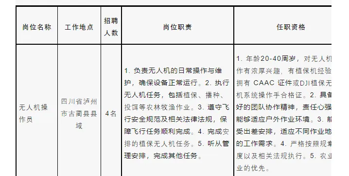 无人机操作员 | 四川省泸州市古蔺县县域 | 4名 | 1. 负责无人机的日常操作与维护,确保设备正常运行。2. 执行无人机任务,包括植保、播种、投饵等农林牧渔作业。3. 遵守飞行安全规范及相关法律法规,保障飞行任务顺利完成。4. 完成安排的植保无人机任务。5. 听从管理安排,完成其他任务。 | 1. 年龄20-40周岁,对无人机操作有浓厚兴趣,有植保机经验,拥有 CAAC 证件或DJI植保无人机系统操作手合格证。2. 具备良好的团队协作精神,责任心强,能够适应户外作业环境。3. 能接受出差安排,适应不同作业地点的工作需求。4. 严格按照规章制度以及相关法规执行。5. 农业专业的优先。 | 基本工资+五险+绩效(综合月薪6000元以上) |