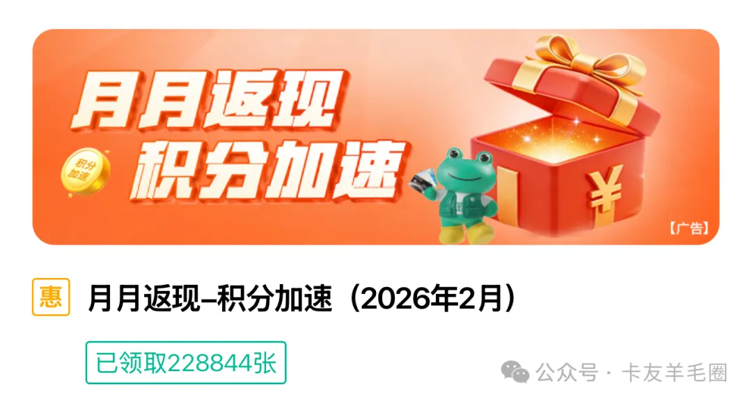 活动路径:农行APP-信用卡-优惠专区-月月返现-积分加速(2026年2月)(新上小动物,还能秒到,刷卡抽红包(必中)10-500,五年不提价了)