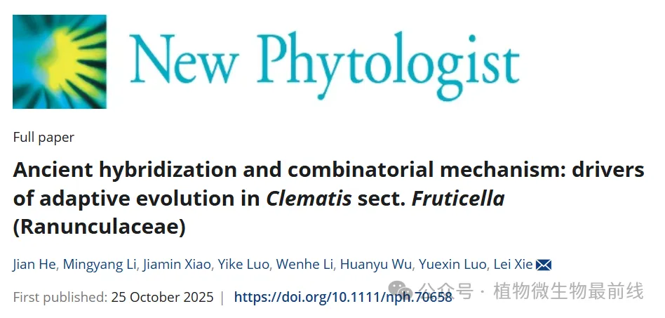 近日,北京林业大学生态与自然保护学院科研团队在植物杂交与适应性进化机制领域取得新进展,在《New Phytologist》期刊中以“Ancient hybridization and combinatorial mechanism: drivers of adaptive evolution in Clematis sect. Fruticella (Ranunculaceae)”为题发表研究论文 。