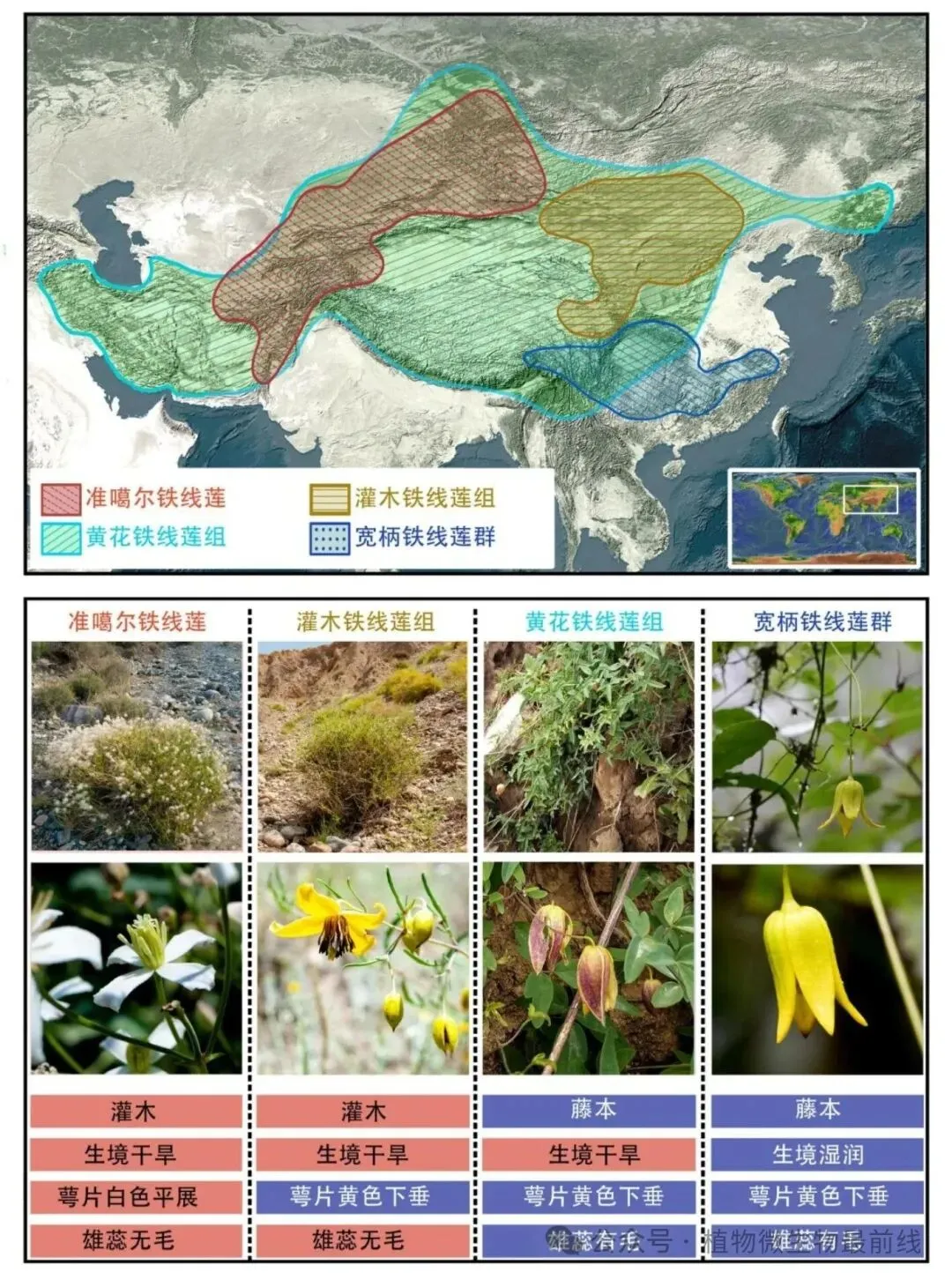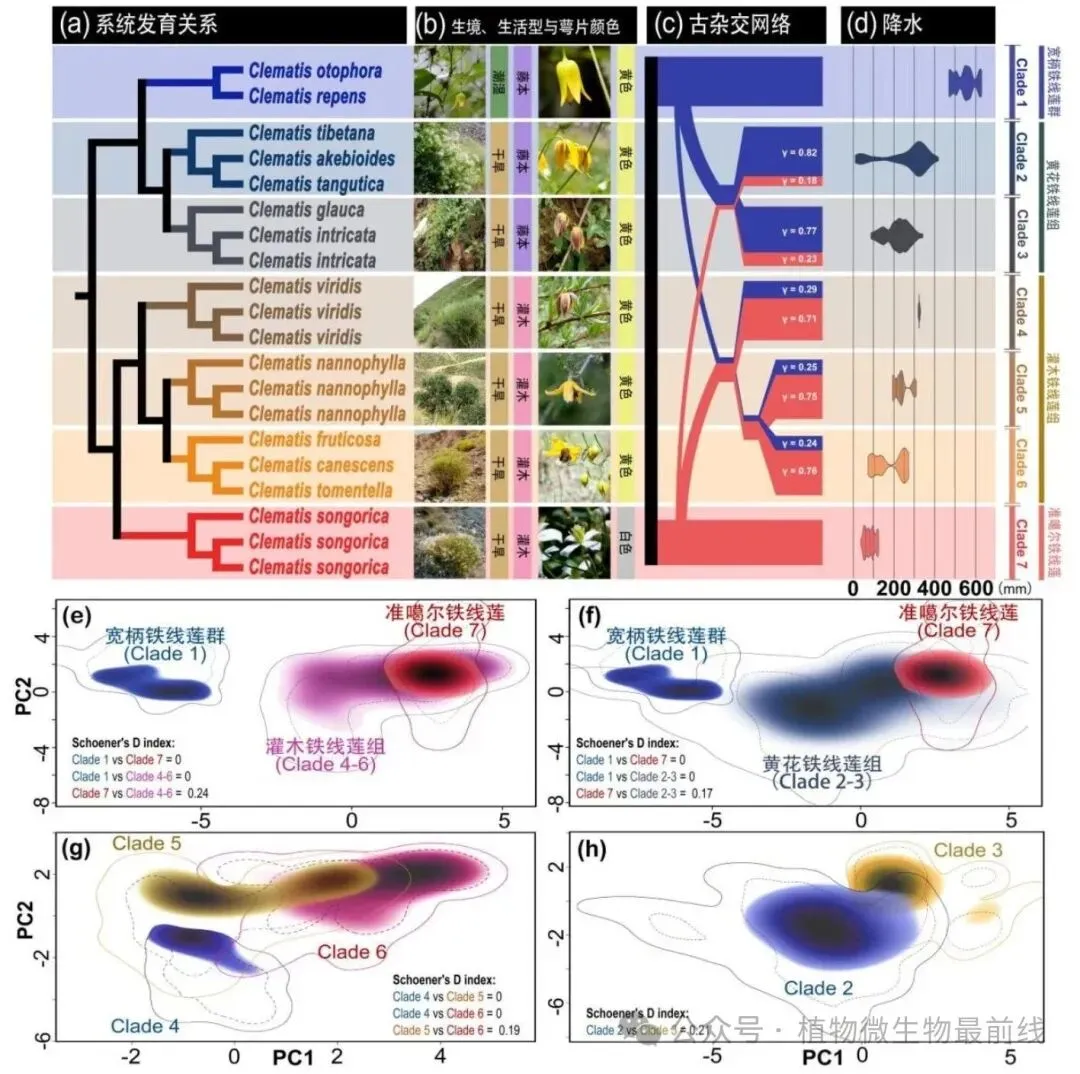 研究结果揭示,灌木铁线莲组及其近缘的黄花铁线莲组均起源于一次古老的杂交事件。它们的共同祖先来自两个生态差异巨大的亲本:一个是适应干旱环境的准噶尔铁线莲,另一个是适应相对湿润环境的宽柄铁线莲群。这两个杂交起源的类群“组合”了来自不同亲本的关键适应性状。更重要的是,它们现今独特的生态适应性(如更耐旱或更喜湿)与其继承自两个亲本的遗传贡献比例(灌木铁线莲组继承了约73%的耐旱亲本基因 ,而黄花铁线莲组仅继承了约20%)显著相关。