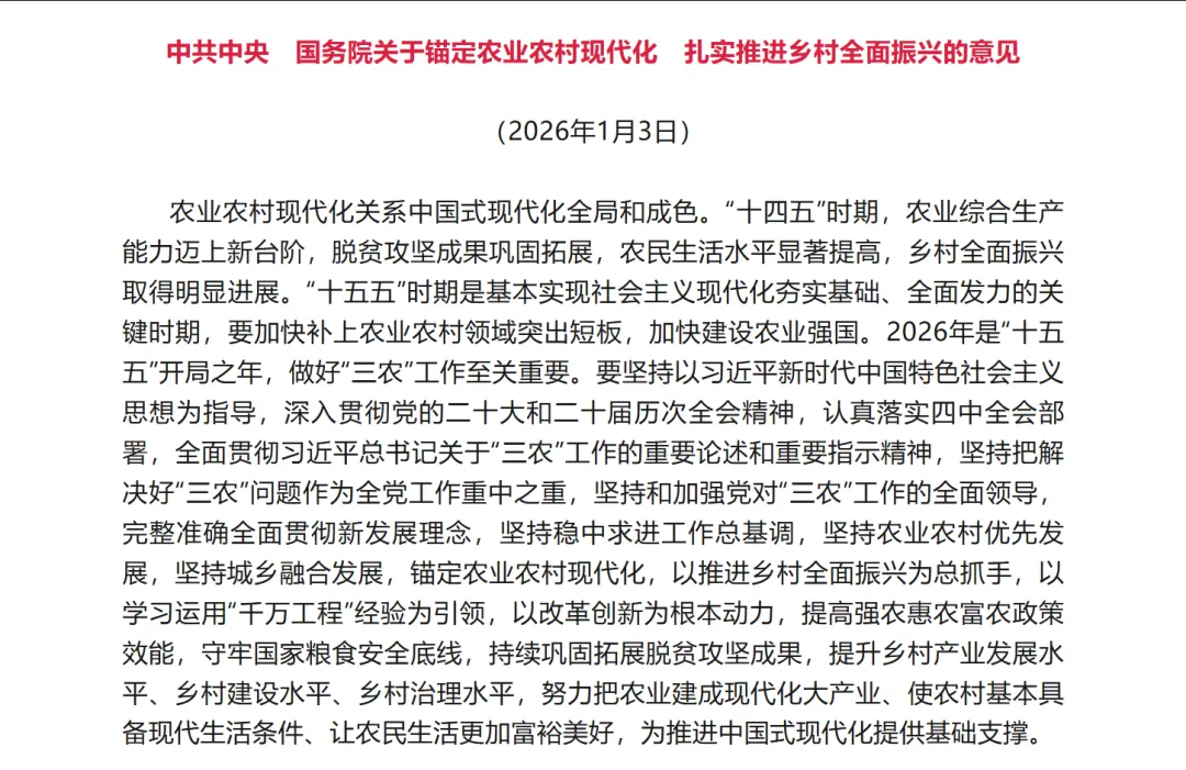 2026年是“十五五”规划的开局之年,也是从“脱贫攻坚”转向“全面振兴”后,从量变到质变的关键节点。不要把这份文件仅仅看作一份政策公告,这是中国经济最大的“潜绩”向“显绩”转化的动员令。当房地产告别高增长,拥有5亿常住人口的县域与乡村,正在成为内需最大的“蓄水池”和新质生产力的“试验田”。今天我们剥离官话套话,用顶级咨询机构的视角,拆解2026年农业农村现代化的底层逻辑与三大核心红利。