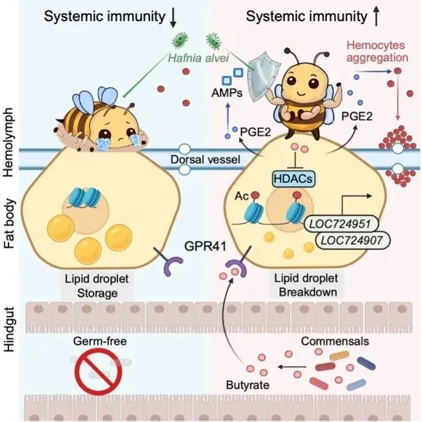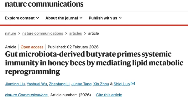 近日,中国农业大学植物保护学院农林生物安全全国重点实验室周欣、罗诗琦研究团队在《Nature Communications》上发表了一项突破性成果,题为Gut microbiota-derived butyrate primes systemic immunity in honey bees by mediating lipid metabolic reprogramming,首次系统揭示了蜜蜂肠道共生菌如何通过一种关键代谢物丁酸,重塑宿主的脂质代谢网络,进而驱动前列腺素的合成,最终激活全身免疫反应,显著提升蜜蜂对病原菌感染的抵抗力。这项研究不仅打通了“肠道微生物—宿主代谢—免疫系统”之间的调控链条,也为理解传粉昆虫健康维持机制提供了全新的理论视角。