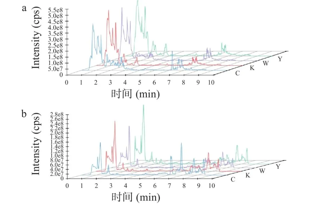 图 1 正(a)和负(b)离子模式下牡蛎消化样本的总离子流图