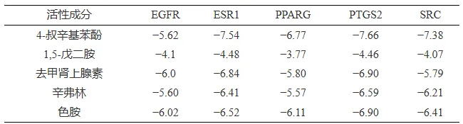 表 1 牡蛎部分关键活性成分与PPI网络中核心靶点的分子对接结合能( kcal/mol)