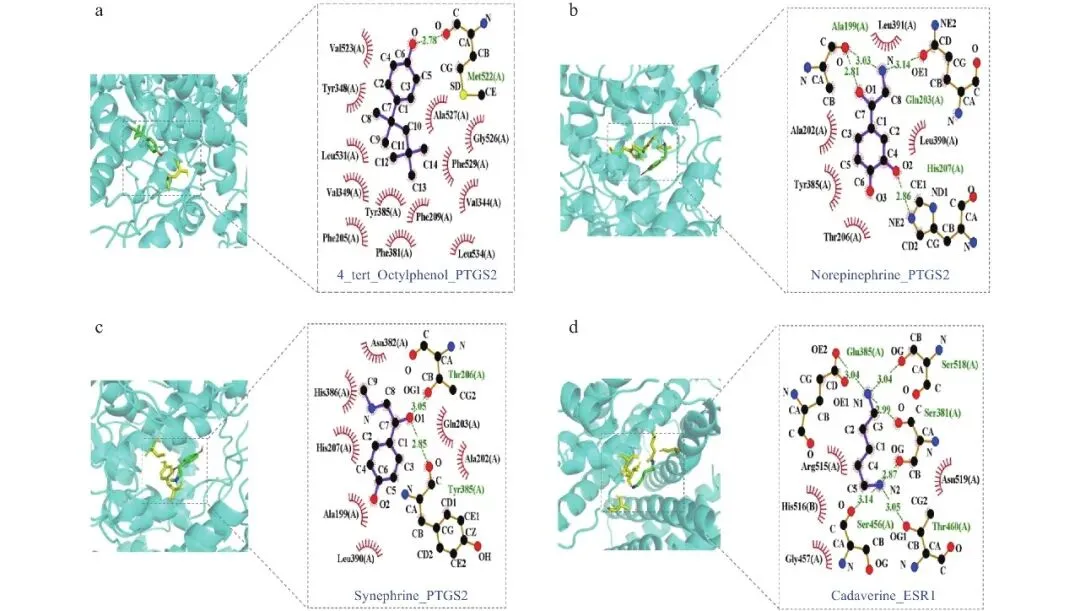 注:a、b、c分别代表4-叔辛基苯酚、去甲肾上腺素、辛弗林与PTGS2的分子对接情况;d为1,5-戊二胺与ESR1的分子对接情况;毛刷状表示与配体发生的疏水作用,绿色虚线代表与配体结合产生的氢键。
