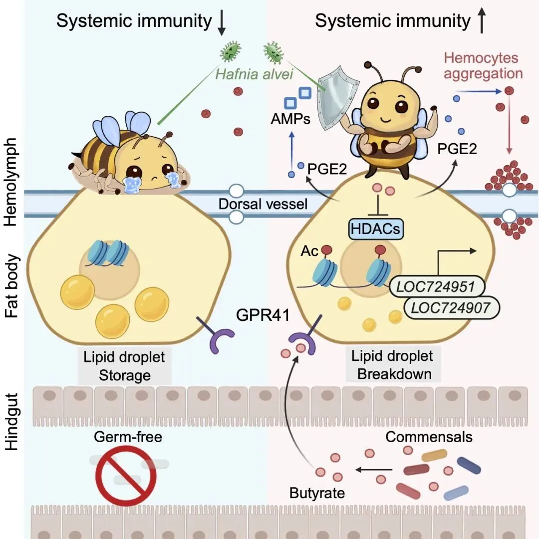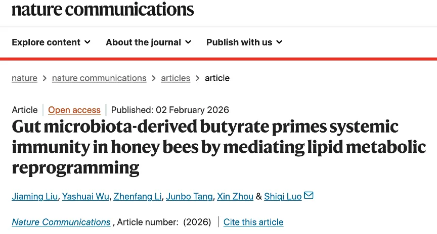 原文链接:Liu, J., Wu, Y., Li, Z., Tang, J., Zhou, X., Luo, S. Gut microbiota-derived butyrate primes systemic immunity in honey bees by mediating lipid metabolic reprogramming. Nature Communications (2026). https://doi.org/10.1038/s41467-026-69073-0