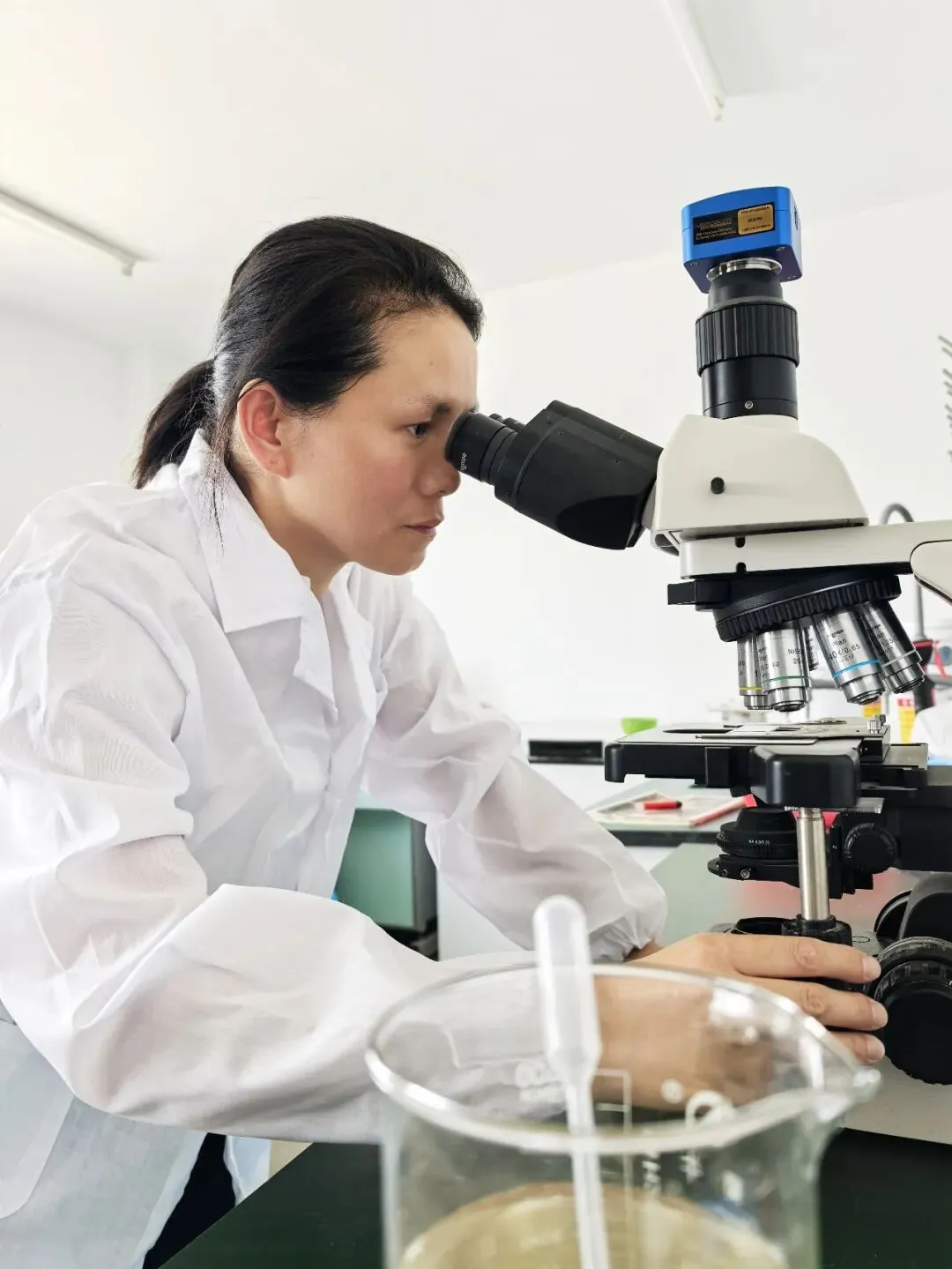 ■激活蓝色产业“新引擎”。陈丽芝借助帮扶团专家力量,致力破解传统投喂冰鲜小杂鱼造成海洋渔业资源破坏与养殖效益不高的双重困境,通过科学配比养殖饲料,研发并推广青蟹配合饲料替代冰鲜小杂鱼技术,覆盖全县8.1万亩蟹塘,成功改变了传统“以鱼养蟹”模式,减少冰鲜小杂鱼投喂量2.26万吨,有效降低饵料成本、改善水质、减少病害。针对渔业种业“卡脖子”难题,她会同帮扶团成员协同攻关,实现青蟹膏蟹促抱卵率超80%,突破夏秋季亲体培育与育苗水质调控技术,实现全年不间断供苗。陈丽芝在实验室开展研究工作、在观察工厂化青蟹苗种培育情况 ■ 构建强村富民“共同体”。陈丽芝联合帮扶团成员主持起草了《三门青蟹养殖技术规范》等多项标准,为青蟹养殖提供了技术指南,以技术红利打开共同富裕之门。她还积极推动海水池塘养殖互助保险、青蟹饲料补贴等惠渔政策,引导养殖户积极拥抱直播带货等新业态,既强化了风险保障,又拓宽了增收渠道,带动3300余养殖户综合效益提高10%以上。其成功经验和技术模式还向域外辐射,推广至河南、宁夏盐碱地及非洲莫桑比克等地,拓展域外养殖面积46万亩,惠及超10万从业者,书写了科技兴渔、共同富裕的动人篇章。
