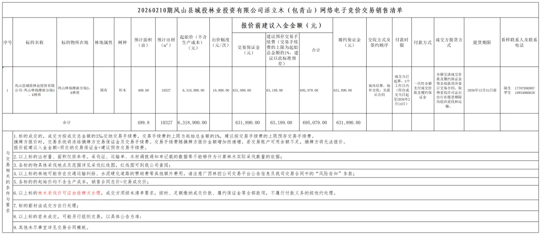 20260210(周二)凤山县城投林业投资有限公司活立木(包青山)交易项目销售标的如下: