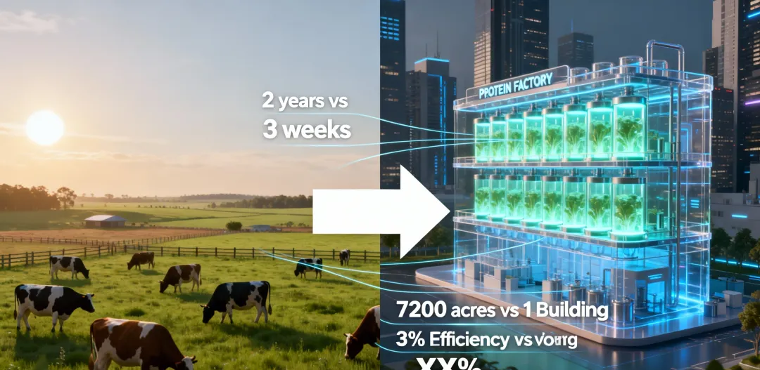 空间压缩:一个10万升的生物反应器,年产量相当于一个7200亩的传统牧场