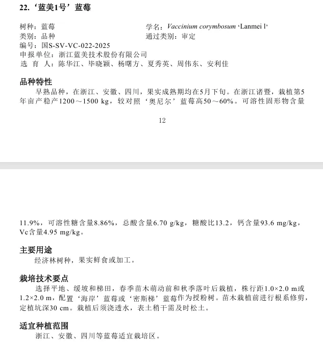 2025年12月31日,国家林业和草原局发布2025年第17号公告《2025年度林木良种名录及2025年度撤销审定林木良种目录》,“蓝美1号”蓝莓品种(第22项)等23个品种通过国家林业和草原局林木品种审定委员会审定,并在适宜种植范围内推广使用。“蓝美1号” 蓝莓品种由浙江蓝美技术股份有限公司申报,蓝美股份成立后利用资本的力量迅速整合了一个科研团队,投入近7000万元的科研资金,与中科院南京植物研究所、浙江省农科院等合作,专门做蓝莓品种培育和研发。
