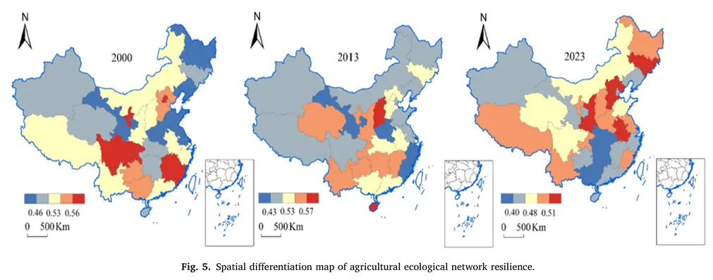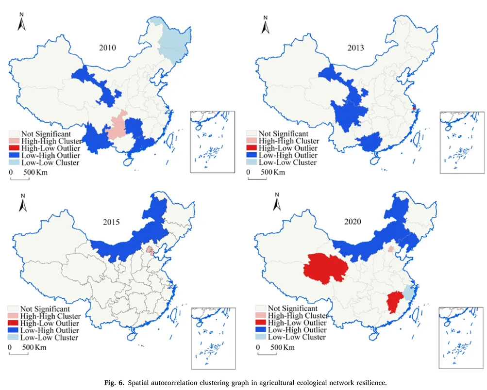 农业生态安全屏障诊断工具:研究识别出湖南、湖北等低韧性高风险区及京津冀等高值集聚区,为精准定位农业生态网络脆弱节点、优化“山水林田湖草沙”一体化保护修复工程布局提供空间显式决策支持。