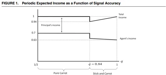 本文关注的是主权国家获取信息的方式如何影响其进行内部调节的能力。作者提出的理论模型是基于传统委托-代理模型的一个变体,主要包含三个特征。首先,作者关注代理人(即农民)和委托人(即政府)之间信息不对称程度的变化。政府可以观察到一个决定了农民的劳作的生产力上限的自然状态信号,例如尼罗河的泛滥程度。在这个信号的基础上,委托人模糊地推断代理人是否努力劳作。这个信号的准确度是该模型主要的外生变量,代表着农业生产的透明度。其次,作者将委托人的激励方式限制在报酬和威胁解雇偷懒农民(剥夺土地、停止租佃)的制裁当中,同时假设这种制裁对委托人来说也是代价高昂的。第三,为了使解雇威胁有意义,作者将模型嵌入到多周期环境中。模型的结果相当直观(图1.):超过阈值之后,信号越准确,报酬的作用越小,制裁的作用越大,委托人获得的收入也越多。作者的解释是,更高的生产透明度导致了一种奴役,因为农民难以保留自己的收成,并可能因偷懒而被驱逐;而当透明度较低时,农民有机会保留更多的作物,却不面临威胁。产权被普遍认为是由寻求收入最大化的国家授予的,但在诺斯的表述中,统治阶层通过授予产权来鼓励被统治者私人投资,即产权作为一种承诺手段来克服事后征收的阻碍。相反,本文的框架内,私人投资不起作用。通过关注阻碍产出分配的信息约束,该理论为土地产权的出现提供了另一种解释。