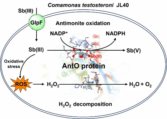 该研究以前期从锑污染环境分离的睾丸酮丛毛单胞菌JL40为对象,探究其Sb(III)氧化解毒机制。通过差异蛋白质组学筛选出新型双功能酶AntO,qRT-PCR证实其转录受Sb(III)和H₂O₂诱导。进化分析显示未一种新型锑氧化和过氧化氢酶。AntO的异源表达赋予大肠杆菌Sb(III)抗性与氧化活性。报告基因实验证实受Sb(III)和H₂O₂诱导。敲除antO使菌株JL40胞内H₂O₂积累,加速Sb (III)非生物氧化,antO超表达则通过酶促反应提升氧化效率。体外酶活实验表明,AntO以NADP+为电子受体催化Sb(III)氧化为Sb(V),同时具备催化H₂O₂分解能力。分子对接验证两种催化功能对应AntO不同结构域。基于上述结果,研究者提出如下工作模型:当Sb(III)进入细胞,诱导细胞氧化压力增加,从而导致胞内H₂O₂含量增加。AntO上调表达催化H₂O₂分解以缓解氧化应激,同时催化Sb(III)氧化为Sb(V)解毒。