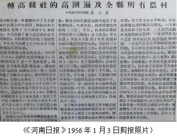 突击实现阶段:毛主席在《关于农业合作化问题》的报告最后说:“全面规划,加强领导,这就是我们的方针。”据此,新乡地委规划到1958年建成2000个高级社,参加农户占总农户的70%;修武县委则规划到1957年入高级社的农户达到总农户的80%。但形势的发展那么出乎人们的意料,在从1955年12月19日到1956年元月2日的15天时间内,全县就建成高级社45个,入社农户35284户,占总农户的99.8%。在极度兴奋之中,我撰写了《转高级社的高潮遍及全县所有农村》一文,以县委书记张洋芹的名义发表在《河南日报》1956年1月3日第二版。