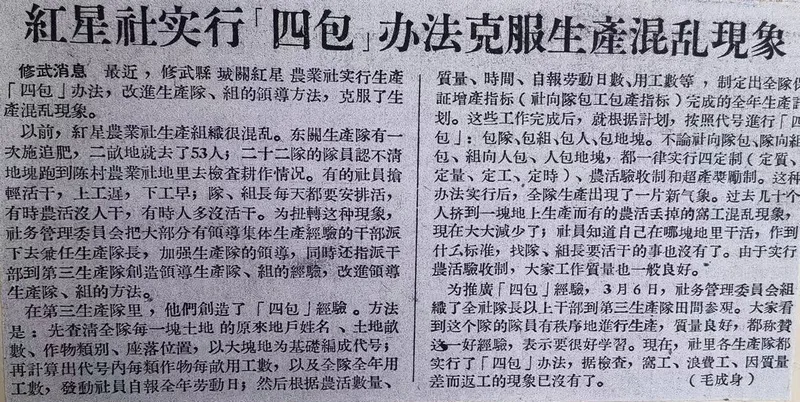 实行“七包”责任制阶段:高级社虽然具有土地连片、便于机耕和因地种植等优势,可以集中财力、物力、人力进行大规模基础建设,抵御自然灾害,尤其是使鳏寡孤独的老人和贫困的农民生活得到了保障,从而彻底避免了阶级两极分化。但它的“早产”,显然有违马克思主义关于生产关系必须与生产力相适应的原理。在尚需人力拉犁、拉耙、推水车这么低下的生产力,显然与完全社会主义化的生产关系不相适应。所以高级社在显示出其一定的优越性的同时,也暴露出来一些弊端。诸如社的规模过大,权力过分集中,社员出勤多、效率低,公共积累多、社员分配少,集体投资大、增产不增收……城关红星社由十多个村组成,纵横十余里,队长分了生产任务,社员找不到地块;原来的初级社贫富差距大,合并在一起,以高级社为核算单位,变成了穷队吃富队,原富社的社员有意见,就想分社、退社,高级社刚成立时那股被鼓动起来的热情干劲,也慢慢减退。中共新乡地委经过深入调研,于1956年12月1日下发《关于冬季巩固提高农业生产合作社的指示》,要求在全区普遍推广“包工包产到队,固定三年不变,超产奖励”的地段责任制。修武县根据本县情况,实行的是“七包”,即高级社把土地、产量、工分、农具、牲畜、树木、投资七项指标分配到生产队,固定三年不变,超产奖励,并要订立合同,以昭信用。这种办法,具有包的时间长、包的种类多、权力下放多、奖励幅度大等优点,很受干部社员欢迎;但工作却非常浩繁细致,全县各级领导和工作人员都为之付出了极多的精力和心血,县委办公室和农村工作部的干事们更是忙得精疲力竭。1957年元月的一天,地委两位同志来修武检查“七包”工作,县委张书记派我陪同他们到郇封一带视察,在南柳高级社的中常村生产队,看到社员们正热火朝天地忙着积肥。该队原计划两个月积农家肥2600车,实行了“七包”,仅仅十多天就已完成1500余车,问他们干劲为什么这么大,大家异口同声地说:去年花了2100元买化肥,结果增产了没增收;现在实行了“七包”,我们要不花一分钱,保证大增产。地委检查组的同志们非常满意。返回后,除写通报予以表扬外,还写了一篇《积肥热潮在常村》的稿件,很快被《修武县报》刊登出来。但是“七包”工作推行起来也并非一帆风顺,我随县委张书记在各地巡回检查后,就发现了不少问题,我将其写成《实行“七包”以后的几个问题》,以张书记的名义发表在《河南日报》1957年3月7日第二版。我另写了一篇小文《“七包”不能有名无实》,刊登在《修武县报》1957年3月21日第三版。