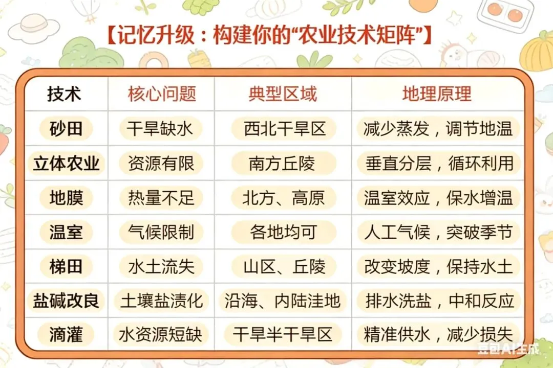 农业技术是人类智慧的地理表达。当你在考场上看到一幅农田景观、一段农业描述,希望这些技术能成为你解码地理关系的钥匙。记住,技术只是手段,背后的人地关系思想,才是地理学科真正的灵魂。