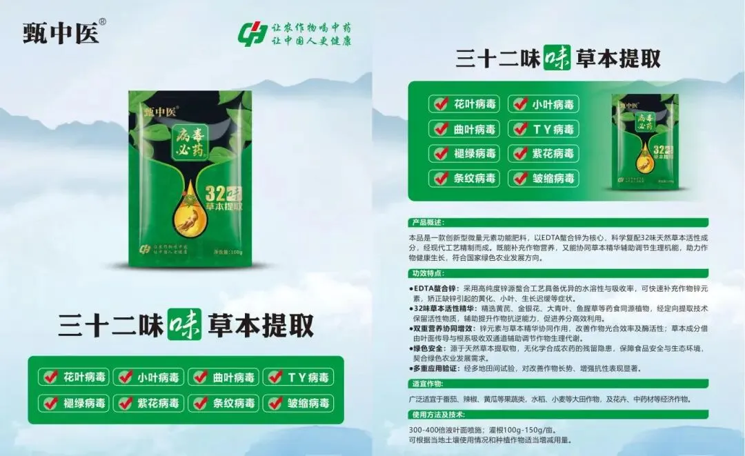 苗期就要开始使用病毒必药进行预防。病毒必药采用32味草本协同作用,依托中医"君臣佐使"组方理念,既能抑制病毒复制,又能增强作物自身免疫力。