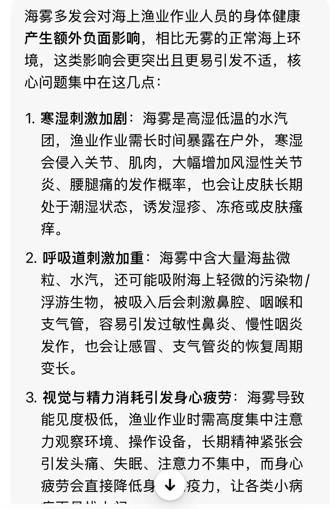 一般答题不写“影响渔民身体健康”,只写影响作业安全、人身安全。