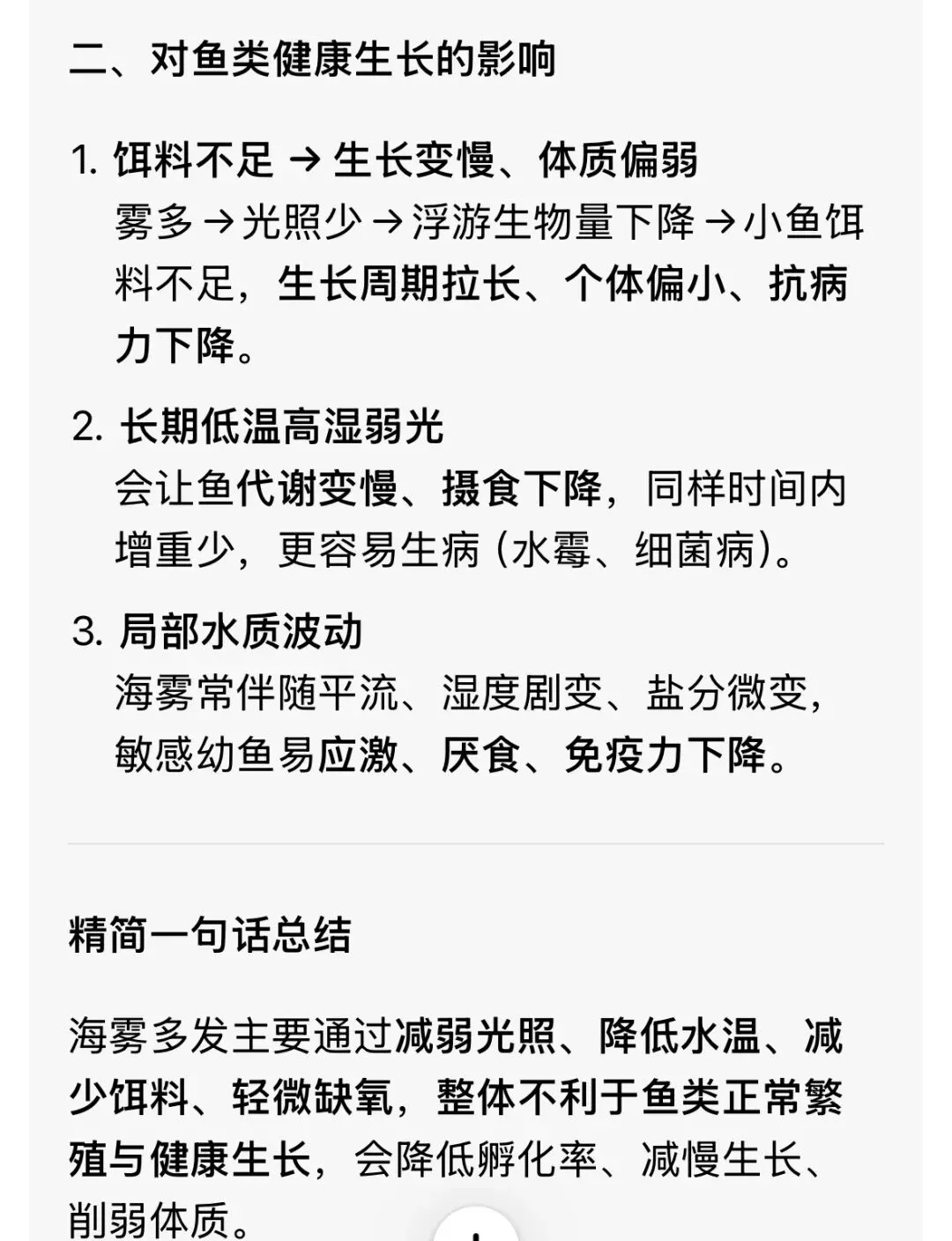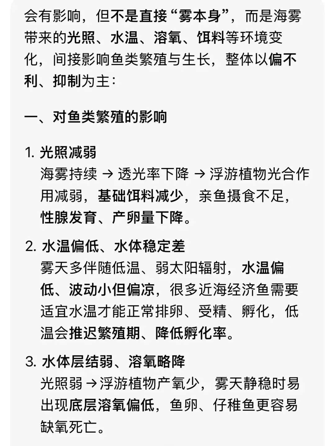 可以写:大雾→光照减弱→浮游植物少→饵料少→鱼类生长/资源受影响;或养殖区光照不足、水质变化等。