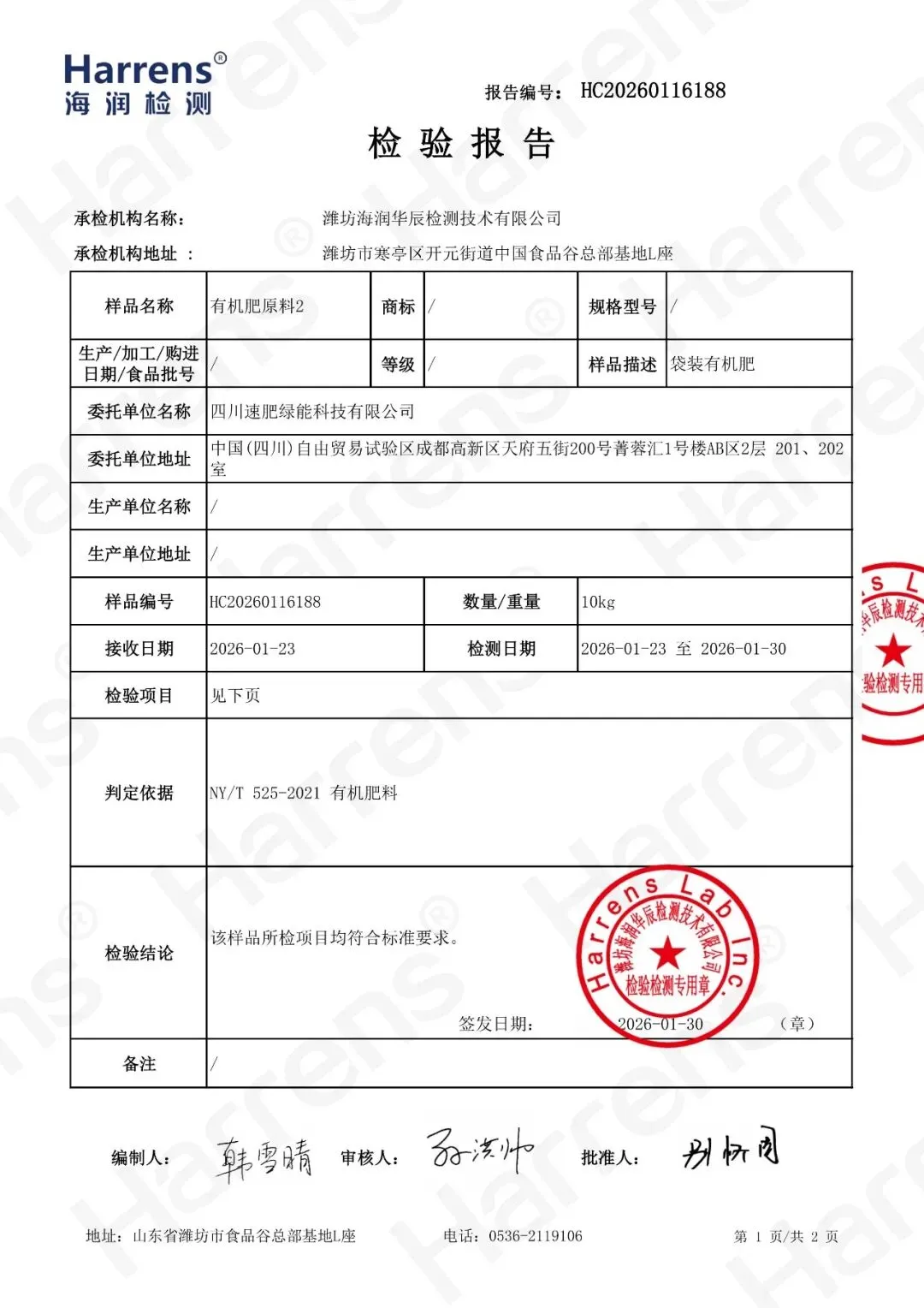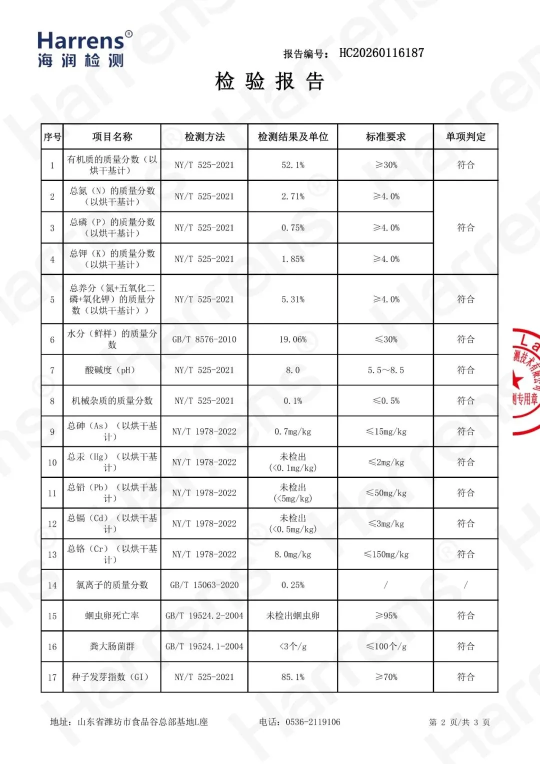 这份由专业检测机构出具的报告,为技术效果提供了权威佐证。对照 NY/T 525-2021《有机肥料标准》,各项核心指标表现亮眼: