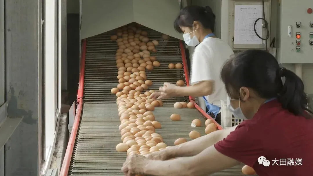 6月7日,在福建省优质农产品标准化示范基地——福建创辉生态农业发展有限公司生产车间,刚产出的鸡蛋沿着传送带输送至收集台,工人正在有序收集。