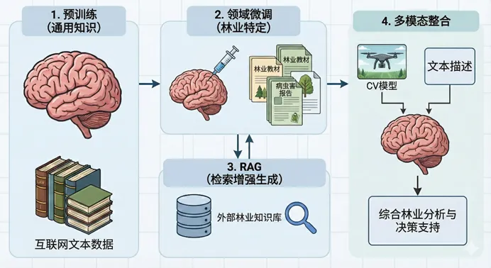 大语言模型在林业中的具体应用并非简单的“开箱即用”,而是需要经过一系列复杂的技术路径和定制化开发,才能使其真正“懂行”并发挥作用。