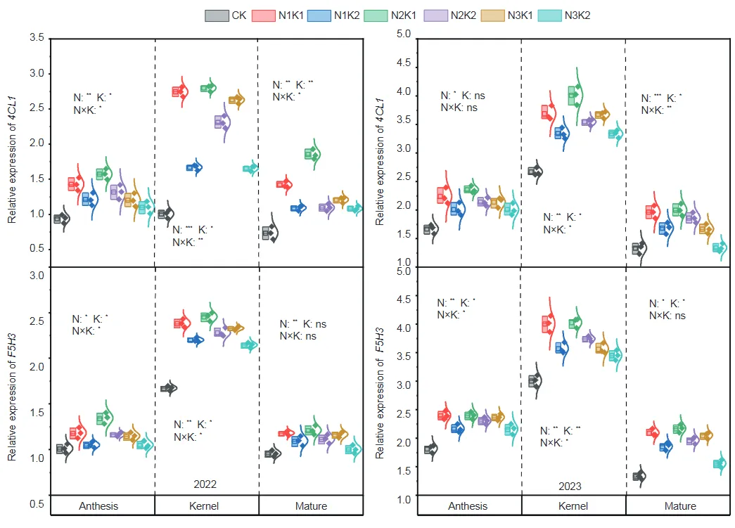 图1不同氮/钾肥互作处理对胡麻茎秆木质素生物合成相关基因表达量的影响