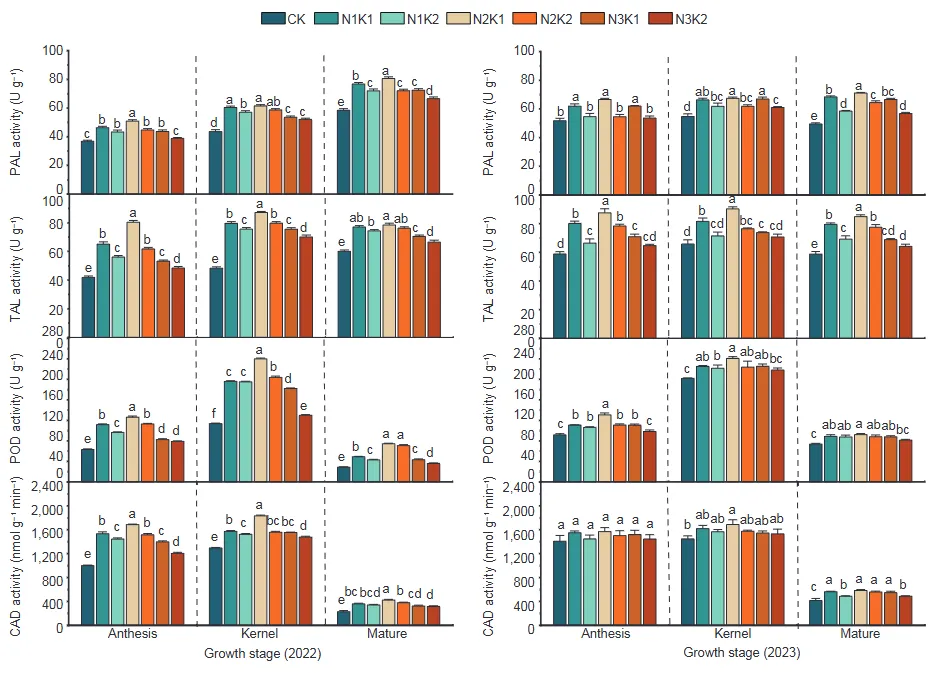 图2 不同氮/钾肥互作处理对胡麻茎秆木质素生物合成相关酶活性的影响