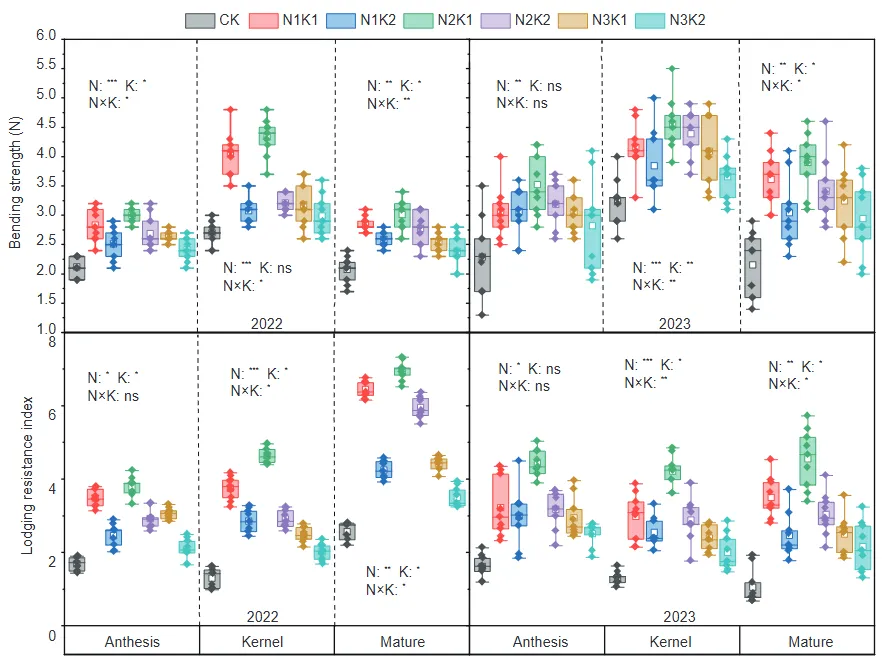 氮钾肥互作对胡麻茎秆木质素生物合成、抗倒伏性及籽粒产量具有显著的协同调控效应。本研究从“养分管理-分子生理-结构力学-最终产量”角度,强调了在胡麻抗倒伏管理中实现氮钾协同调控的关键作用,尤其指出在低/中氮肥配施中钾肥处理显著促进了木质素合成积累,提高了陇中旱作农业区胡麻的抗倒伏能力和籽粒产量,为旱作区胡麻抗逆高产高效栽培提供了理论依据与技术支撑。