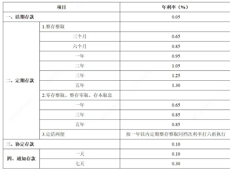 农业银行普通定期存款利率如下:三个月0.65%,六个月0.85%,一年0.95%,二年1.05%,三年1.25%,五年1.30%,